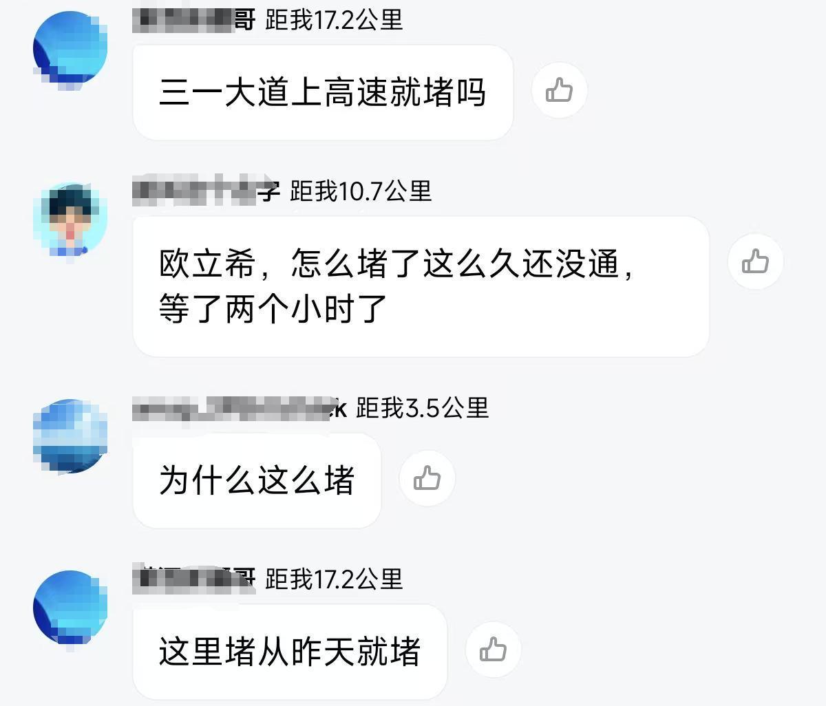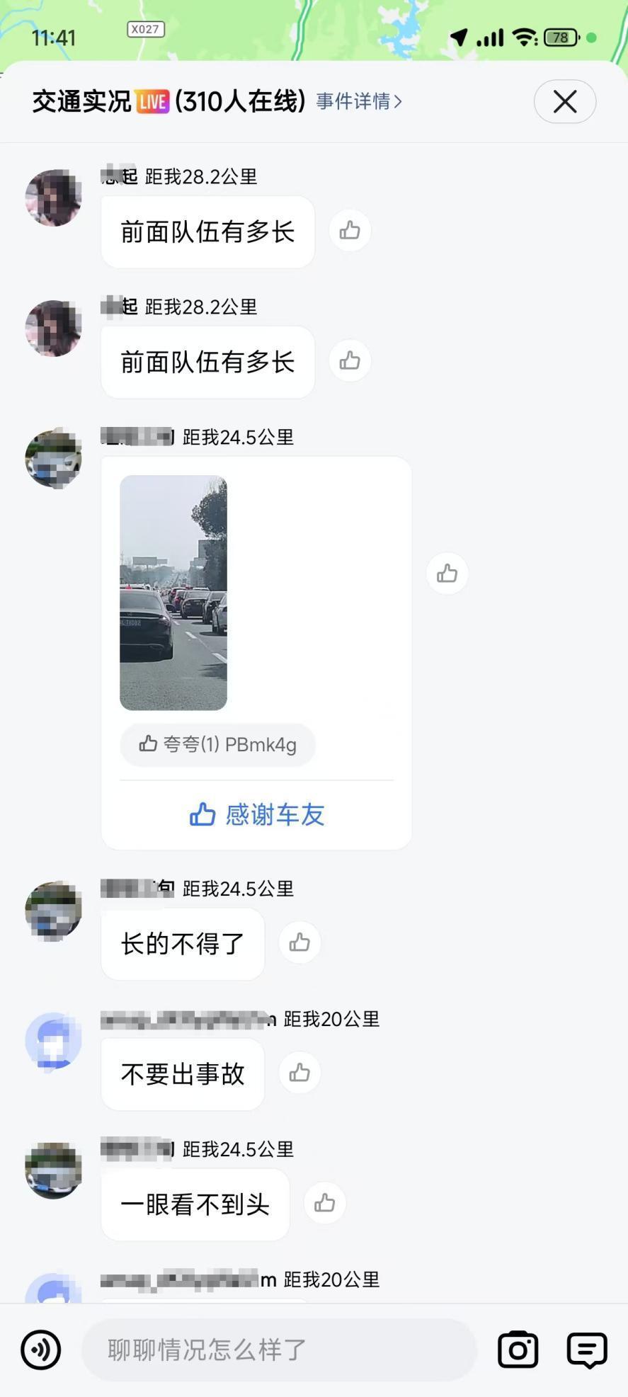 拥堵最严重的G6021杭长高速长沙段,高德地图的交通实况聊天群里聚集了300多位堵在路上的车友,他们反馈队伍长到“一眼看不到头”。