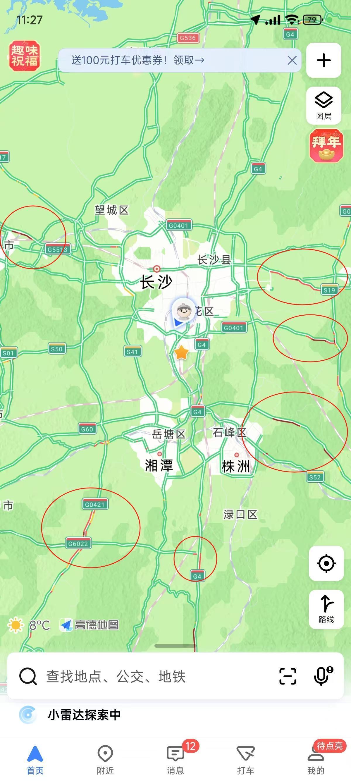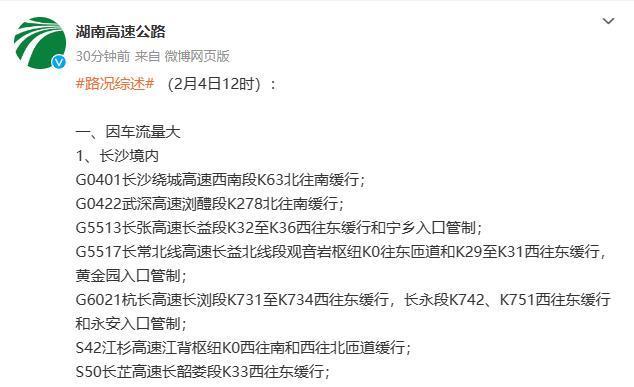 湖南高速公路官微通报,截至2月4日12时,长沙境内有7个路段因车流量大出现了缓行和管制。