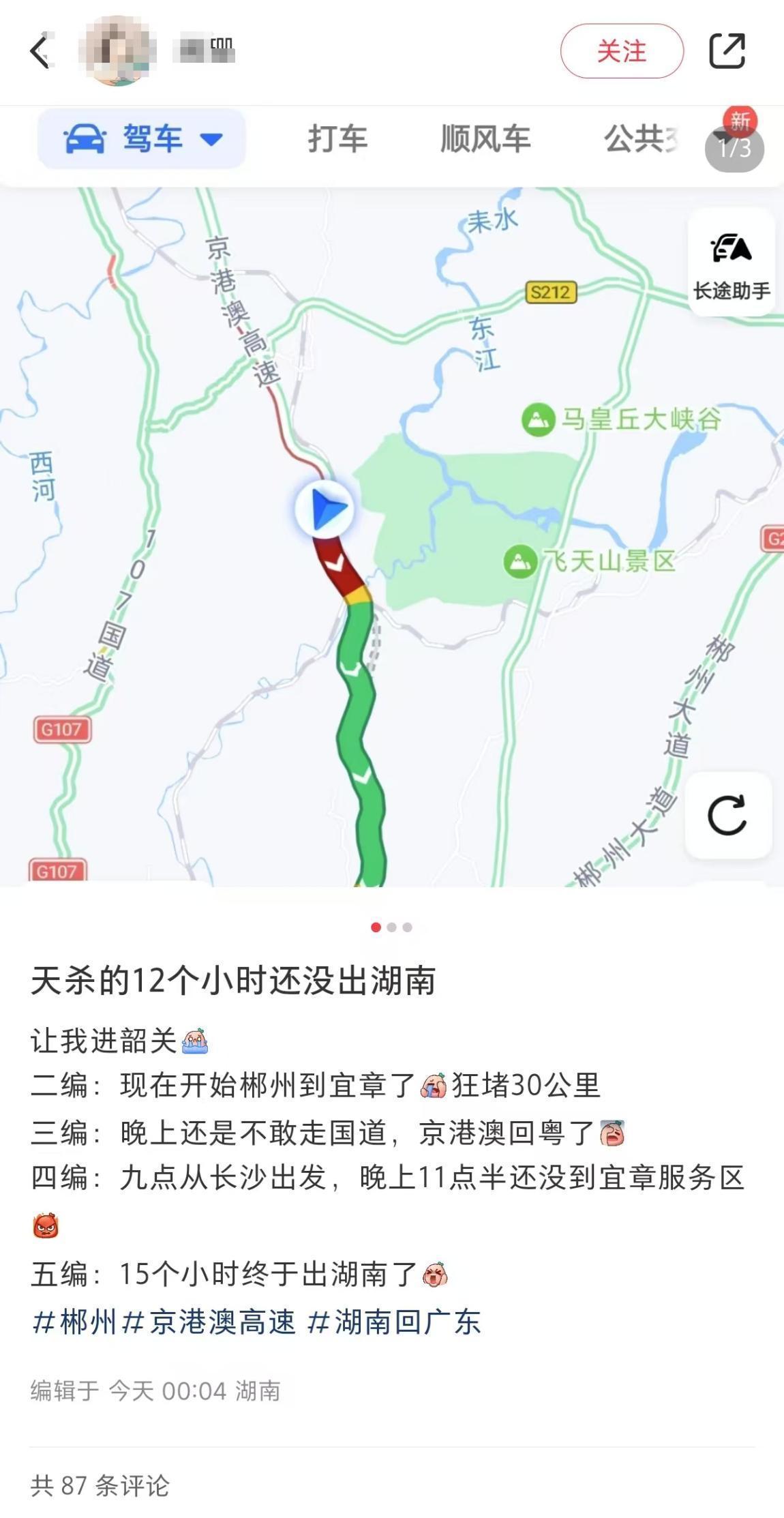 长沙出城、湖南通往外省的几个主要通道同样堵得厉害。有网友3日晚9点半从长沙出发,今天中午11:26还在郴州,说不仅高速堵,国道也堵。还有走京港澳高速从湖南回广东的网友,花了整整15个小时才走出湖南。